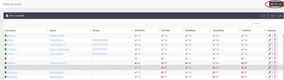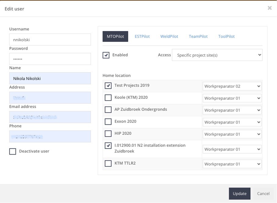 - Kies voor elke applicatie (bijvoorbeeld MTOPilot, ESTPilot, etc.) welke rechten de gebruiker moet hebben. Dit kan per project worden gedaan of in één keer voor alle projecten.
