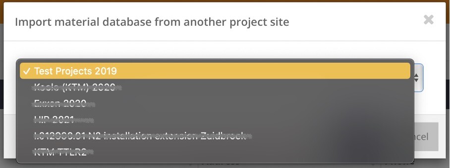 Om een materiaalbibliotheek van een ander project te koppelen aan het nieuw aangemaakte project, klik je op de pijl naast het project (zie screenshot hieronder).