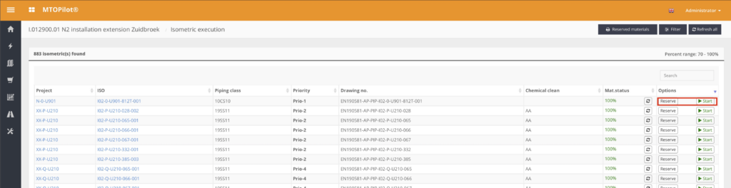 Als je eerst aan de hand van prioriteiten wilt bekijken wat je kunt opstarten, klik dan eerst op 'Reserve'. Hiermee reserveer je materialen voor de betreffende isometrische tekening en kun je eventueel een stap terug doen en de reservatie ongedaan maken. Als je op 'Start' hebt geklikt, is deze stap niet meer terug te draaien, tenzij je diverse handelingen per item moet uitvoeren om deze stap te herstellen.
