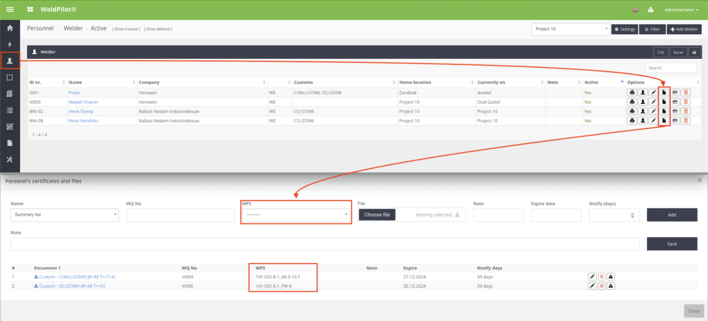 •Lassers kunnen alleen worden toegewezen aan een lasrecord als hun kwalificaties overeenkomen met de vereiste WPS. De voorwaarde is dat alle benodigde gegevens volledig en correct worden ingevuld om deze functie optimaal te laten werken.