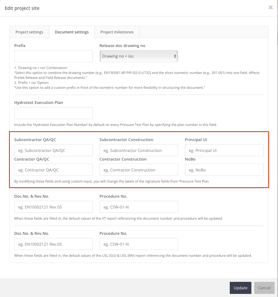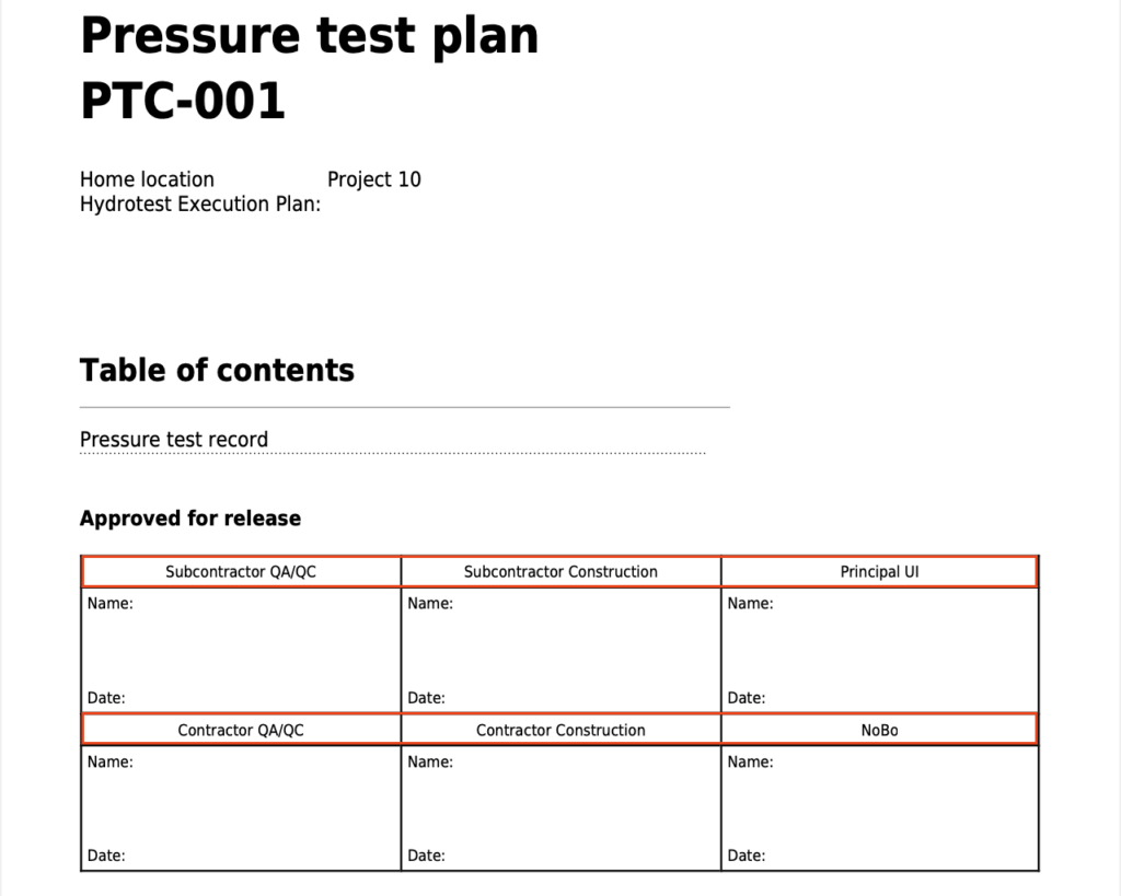 •Door deze velden in te vullen, worden de labels van handtekeningvelden in het Druktestplan automatisch aangepast, wat zorgt voor meer consistentie in de documentatie.
