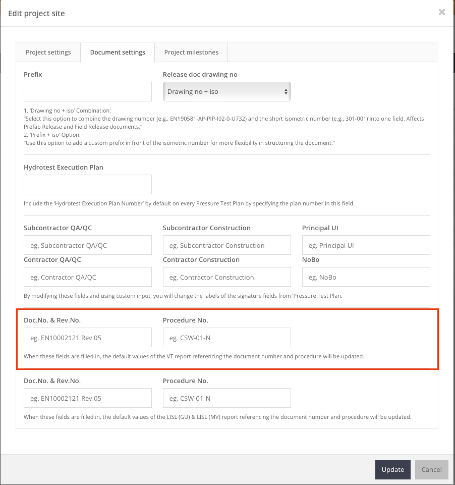 •Bij invulling van deze velden worden de standaardwaarden van het VT-rapport geüpdatet, zodat deze verwijzen naar het juiste documentnummer en de relevante procedure.