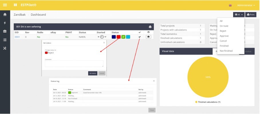 Bij het opstarten van ESTPilot® is het dashboard de eerste pagina die opent. Hierop wordt de status van calculaties weergegeven. Gebruikers met de juiste rechten kunnen de statussen (On hold, Rejected, Approved en Cancelled) aanpassen. Bovendien wordt er een log bijgehouden met alle statussen waarin een calculatie zich heeft bevonden. Gebruik de filteroptie om de weergave te clusteren op basis van dezelfde statussen.