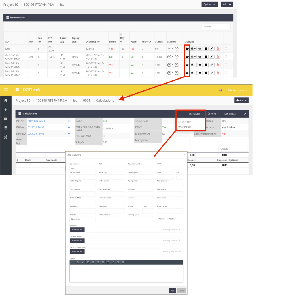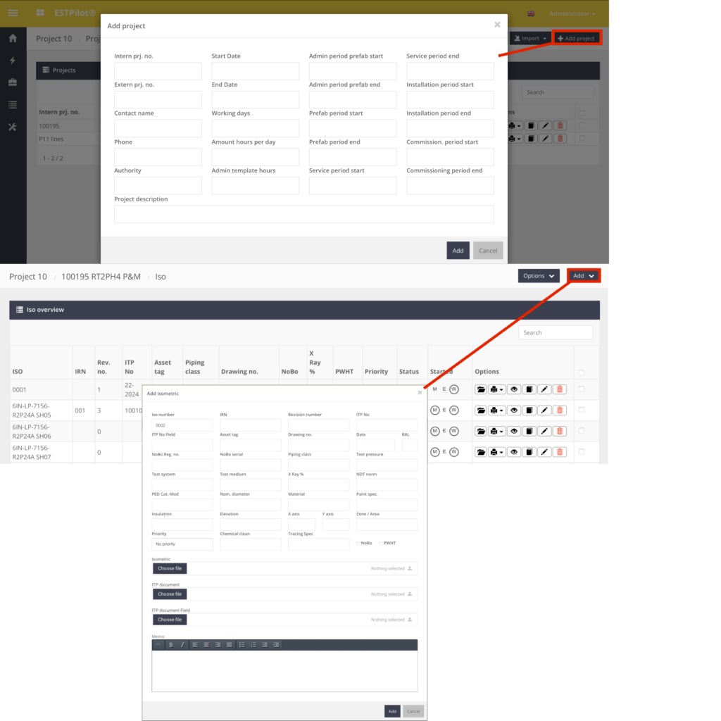 Om een project manueel te maken, ga je naar het menu Project Data en klik je op Projects. Klik vervolgens op Add Project en voer de benodigde gegevens in. Klik op Add om het project op te slaan. Als je wilt, kun je ook isometrics toevoegen door op Add Isometric te klikken, de gegevens in te vullen en op Add te klikken. Herhaal deze stappen om alle benodigde isometrics toe te voegen.
