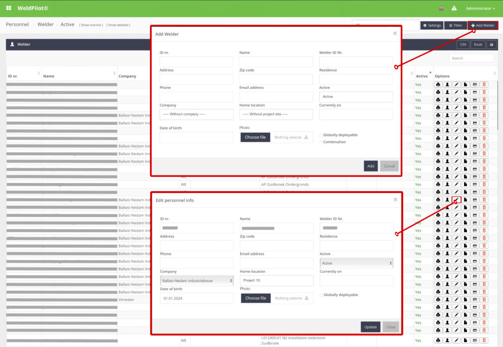 Om een nieuwe lasser toe te voegen, klik je op 'Add Welder'. Door op 'Edit' te klikken, kun je de lasser verder bewerken, als er persoonsgegevens veranderen.