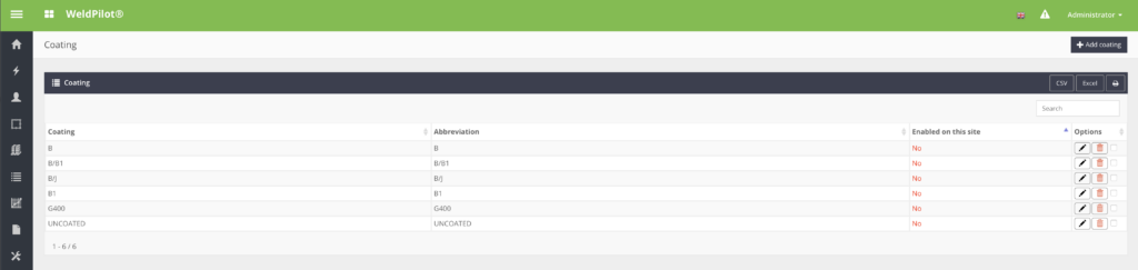 De tabel 'Coatingtypes' bevat een lijst van coatingtypes. In sommige gevallen is het vereist om op de LISL (Logistics Information System Linepipe) aan te geven welk type coating op spools, fittingen en/of lassen is aangebracht.