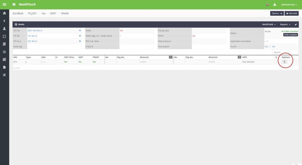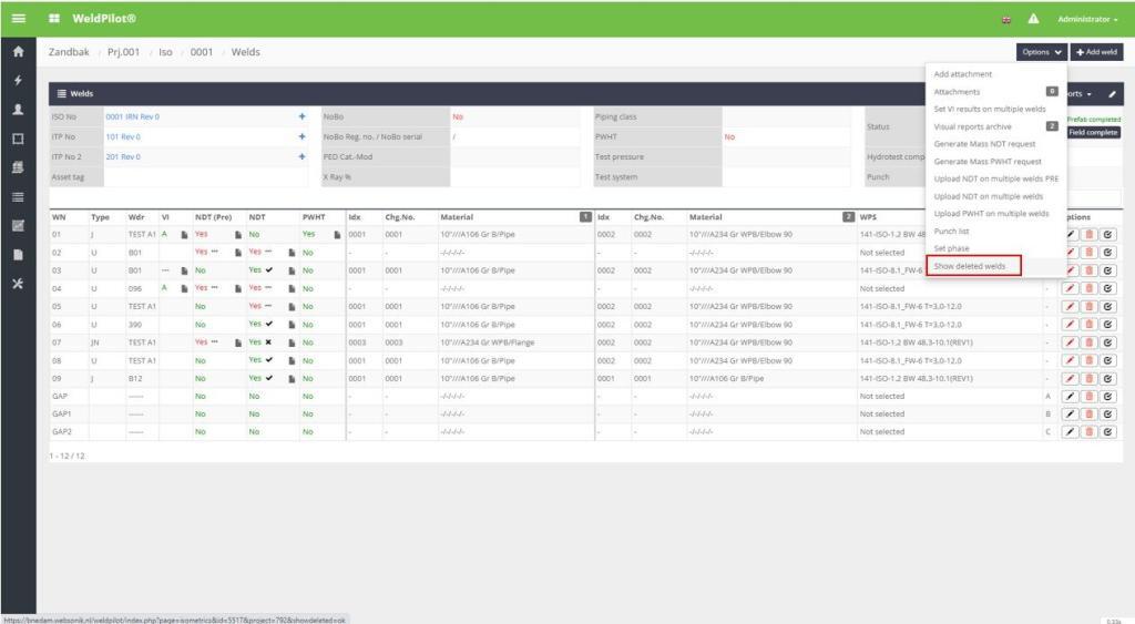 Er is nu een overzicht beschikbaar van verwijderde lassen. Soms worden lassen om diverse redenen door gebruikers verwijderd, soms te voorbarig. Voorheen kon een verwijderde las alleen worden teruggezet wanneer de WS helpdesk hiervoor werd benaderd, maar nu is dit niet meer nodig. Applicatie-administrators (met de hoogste toegangsrechten) kunnen verwijderde lassen zien en deze terugzetten door in een isometric het "Options"-menu te openen en vervolgens op "Show deleted welds" te klikken. Klik vervolgens op de knop "Reset" onder het label "Options".