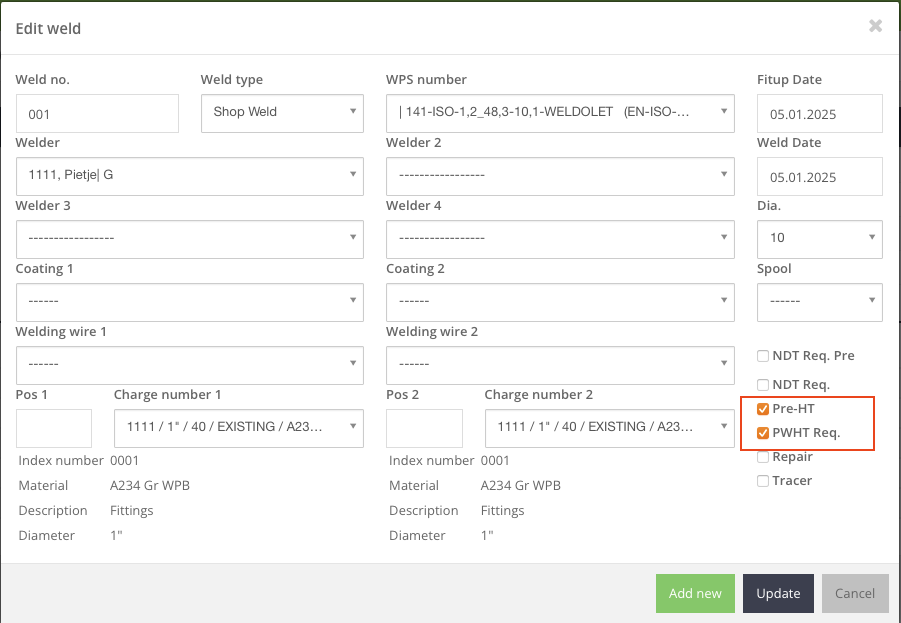 Open lasrecord of gebruik mass edit welds: Nadat u één of meerdere lassen heeft geselecteerd, kunt u aangeven of u Pre-HT en/of PWHT wilt aanvragen door de vinkjes in de respectievelijke kolommen aan te kruisen.