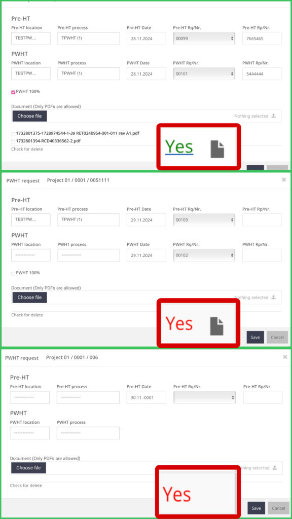 Als er nog geen gegevens zijn ingevoerd om een PWHT-request aan te vragen, wordt er geen icoontje weergegeven. Zodra de benodigde gegevens zijn ingevuld en een request is ingediend, verschijnt het icoontje. Wanneer de PWHT-request is uitgevoerd en eventuele documenten zijn geüpload, verandert de rode markering “Yes” in groen, met het bijbehorende icoontje ernaast: