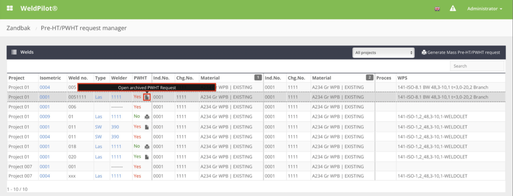 Om gearchiveerde PWHT-requests te openen, klik je op het blad-icoontje naast “Yes”. Het icoontje is toegankelijk, ongeacht of het rood of groen is gemarkeerd: