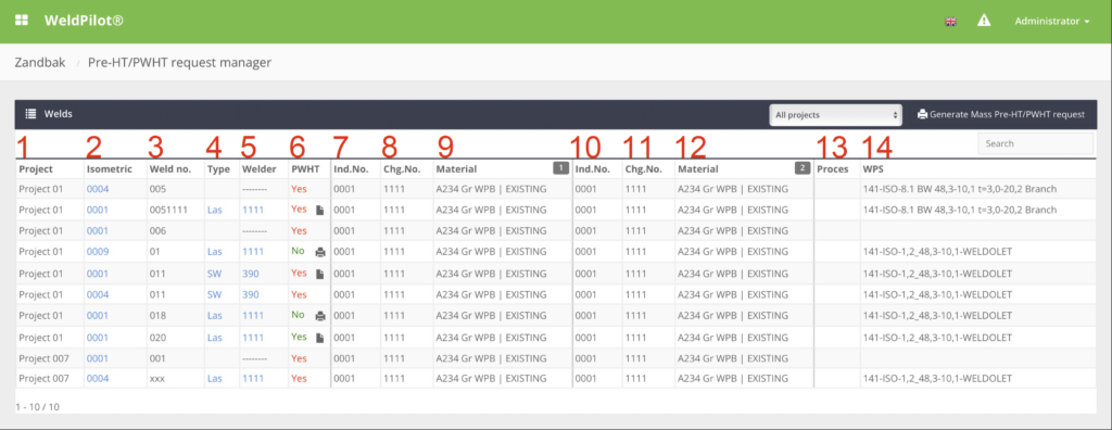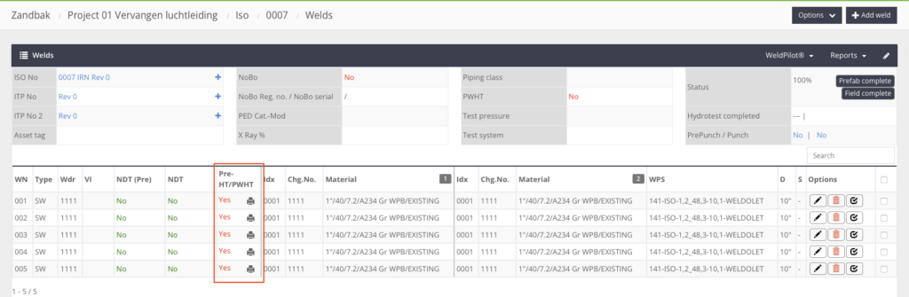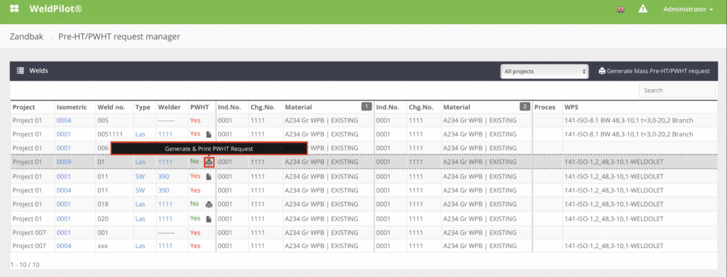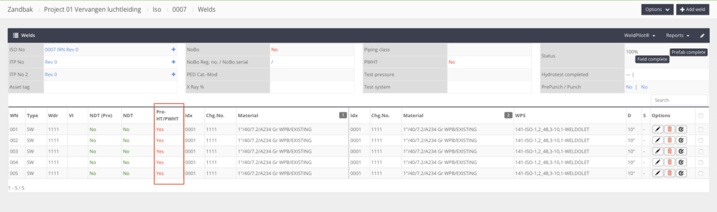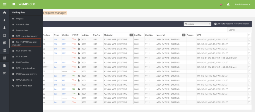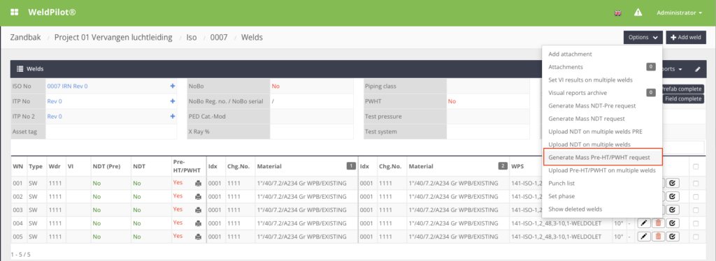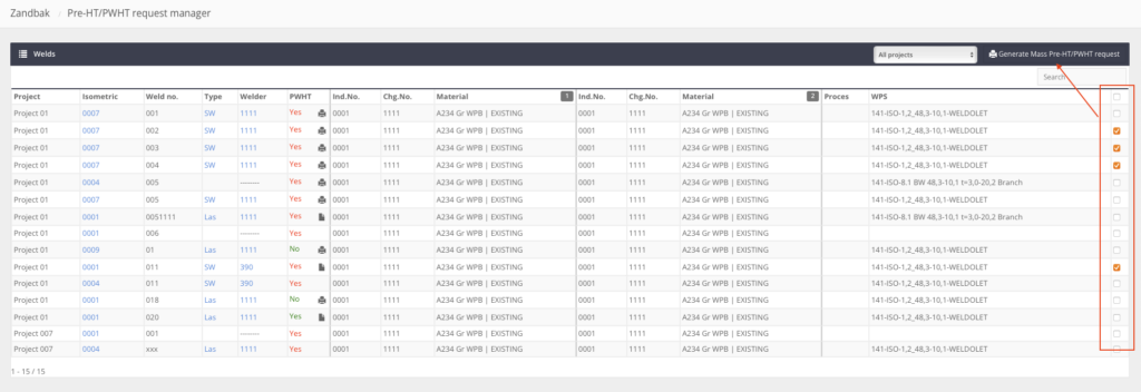 Deze pagina fungeert als een verzamelplaats voor alle lassen in een project waarop nog hitte-onderzoek moet worden uitgevoerd. Het is hier mogelijk om een massa-aanvraag te maken voor de welds. Je maakt hier direct de aanvraag voor alle pre-heat treatments & post weld heat treatments.