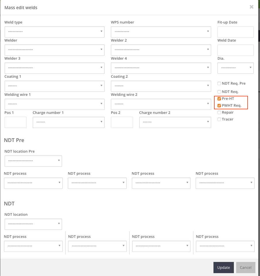Open lasrecord of gebruik mass edit welds: Nadat u één of meerdere lassen heeft geselecteerd, kunt u aangeven of u Pre-HT en/of PWHT wilt aanvragen door de vinkjes in de respectievelijke kolommen aan te kruisen.