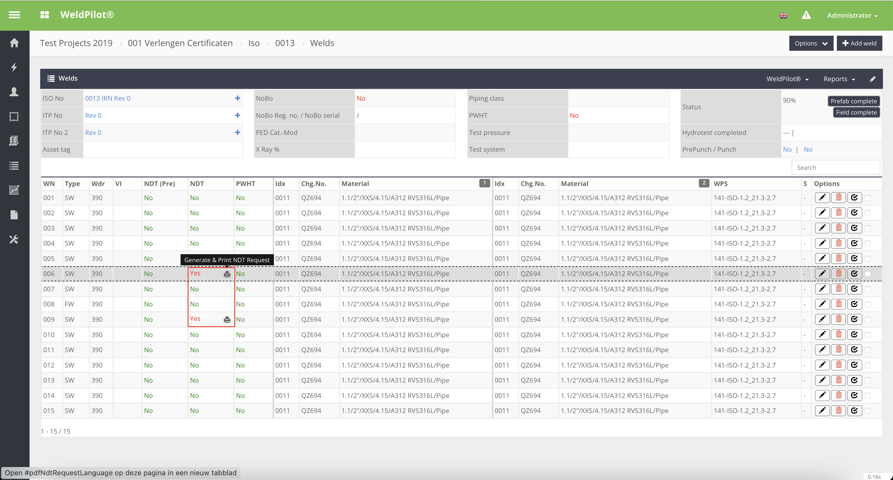 2. Klik op het Printer Icoon of Ga naar Mass Request: Zodra je klaar bent om NDO-aanvragen te doen, klik je op het printer-icoon dat verschijnt naast de las die je wilt onderzoeken. Als alternatief kun je ook naar de "Mass Request" optie gaan.