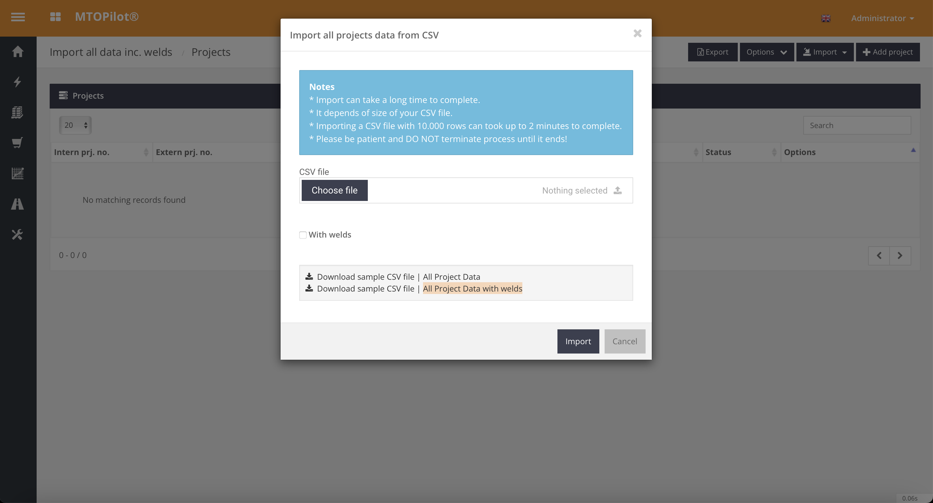 Download het template-bestand genaamd 'All Project Data with welds' vanuit MTOPilot. Dit is een CSV-template dat dient als basis voor het samenstellen van je importdata.