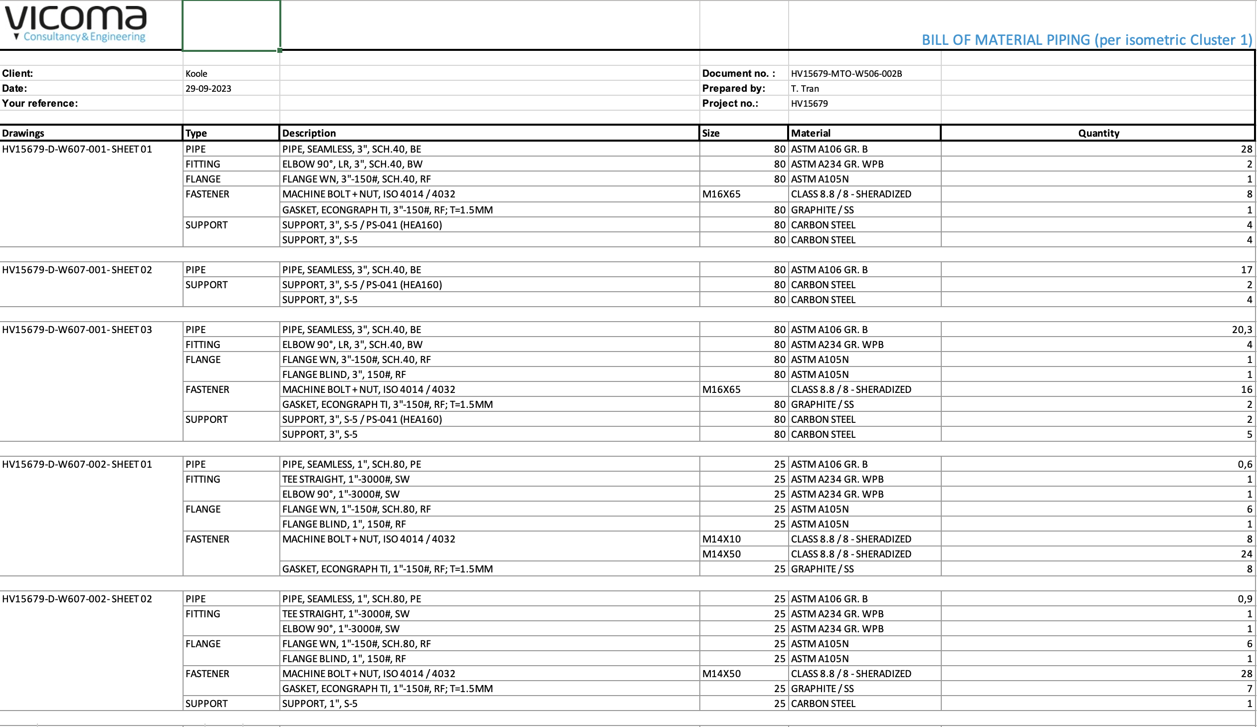 Het verzamelen van de benodigde data is de eerste stap. Vaak is deze data beschikbaar in Excel-formaat vanuit engineering, inclusief lijsten met isometrics, materialen, en technische gegevens van productleidingen, evenals een materiaalbibliotheek met artikelnummers en commodity-codes.
